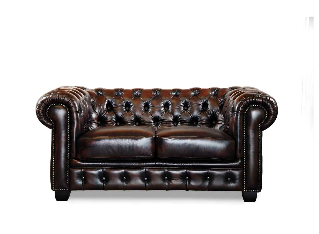 Canapés et fauteuils en cuir antique BRENTON esprit CHESTERFIELD. Coloris Marron ou Rouge. Cuir de buffle Fleur corrigée et pigmentée, épaisseur 0,9 - 1,1 mm. Cuir tanné aux sels de chrome, teinté dans la masse. Tour de caisse en refente de cuir. Ce salon est recouvert exclusivement de cuir de buffle, vous garantissant ainsi qualité, confort et longévité. Assise et dossier garnis de mousse de polyuréthane haute résilience. Densité d'assise 40 kg/m3. Densité du dossier 30 kg/m3. Suspension du dossier sur sangles élastiques. Suspension de l'assise sur ressorts hélicoïdaux. Structure et pieds en bois.