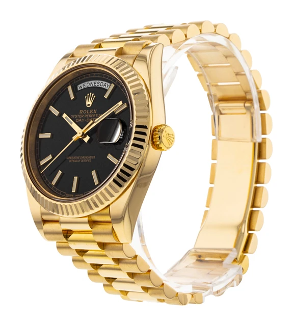 Cette Rolex Day-Date 40 228238 a un cadran de baton noire et un bracelet en bracelet. L'imperméabilité, la précision, le bon fonctionnement et l'état de cette Rolex ont été minutieusement inspectés afin de déterminer le degré de remise en état requis pour répondre à nos normes strictes. Nous avons également étudié sa documentation technique et les archives du fabricant, quand cela s'est avéré possible, afin de garantir l'authenticité de la montre et son passé irréprochable. Pour votre tranquillité d'esprit, toutes nos montres s'accompagnent d'une garantie de 24 mois. L’un de nos techniciens spécialisés dans le polissage a éliminé les marques d’usure quotidienne sur le boîtier et le bracelet de cette montre. Par conséquent, cette montre n’est pas couverte par la garantie restante du fabricant.